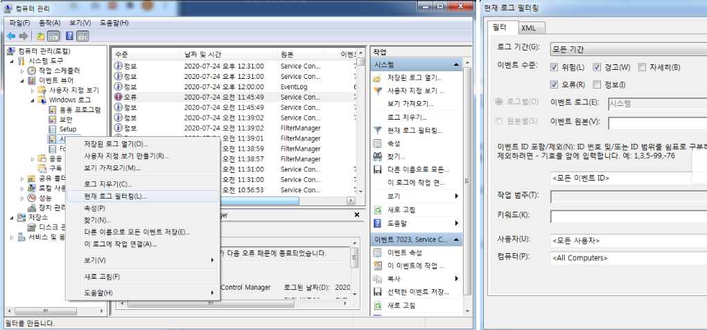 시스템 메뉴 오른쪽 마우스 클릭 → 현재 로그 필터링 클릭 → 위험, 경고, 오류 체크 후 확인 버튼 (windows7)