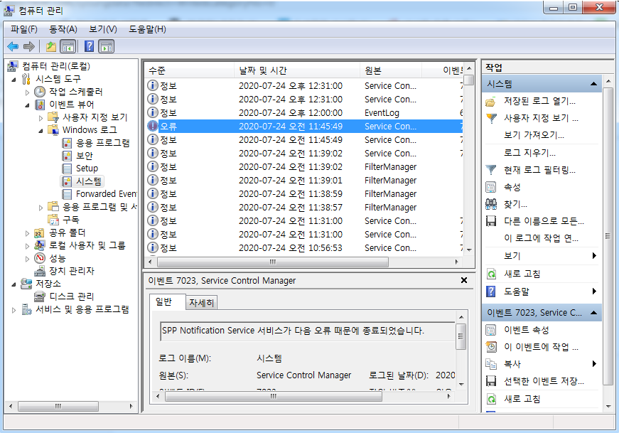 왼쪽 상단에 이벤트 뷰어 클릭 → windows 로그 클릭 → 시스템을 클릭 합니다.
