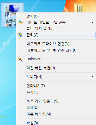 1) 외장하드를 컴퓨터에 연결하지 않는 상태에서 내PC, 컴퓨터 아이콘 마우스 우측 클릭 → 관리 메뉴를 클릭 합니다.