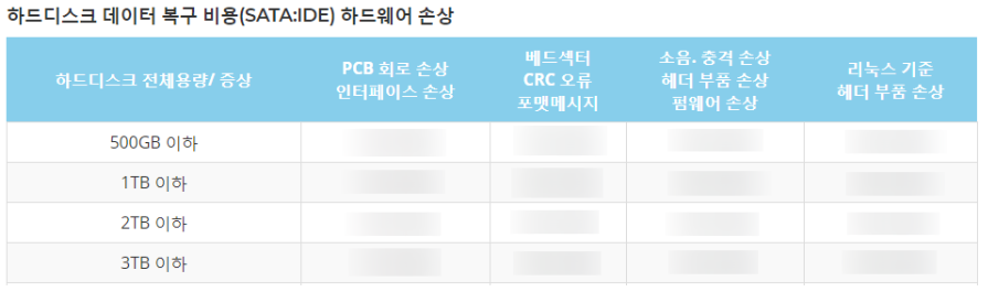 (데이터 복구가 성공하여 출고 시점에만 비용이 단 한번 청구되고, 하드디스크 복구가 안되면 비용은 발생하지 않으며, 데이터복구 업체는 하드디스크의 전체용량 및 손상 원인에 따라서 비용을 책정하고 있습니다.